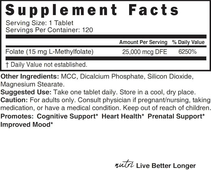 Nutri 5-MTHF L Methylfolate 15MG - 4 Month Supply, 120 Vegan Tablets - Methylated Folate Supplement - Cognitive Function, Heart Health, Prenatal Support - Methylated Folic Acid, MTHFR Supplement…