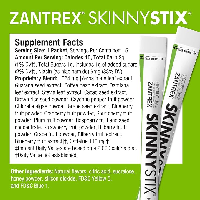 Zantrex SkinnyStix Energy Powder – GLP-1 Support, Boost Mood – 10 Calories – Yerba Mate, Coffee Bean – 15 Stix, Lime