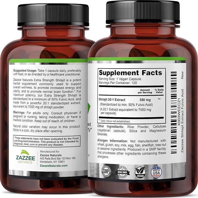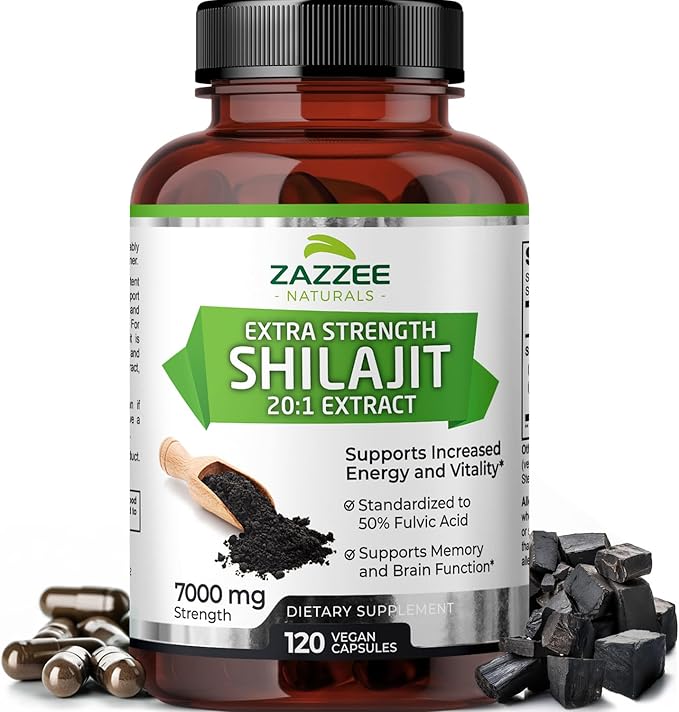 Zazzee 100% Pure Organic Himalayan Shilajit 20:1 Extract, 7000 mg Strength per Capsule, 50% Fulvic Acid, 120 Servings per Bottle, 20X Potency, Rich in Trace Minerals, Non-GMO, Vegan, Made in The USA