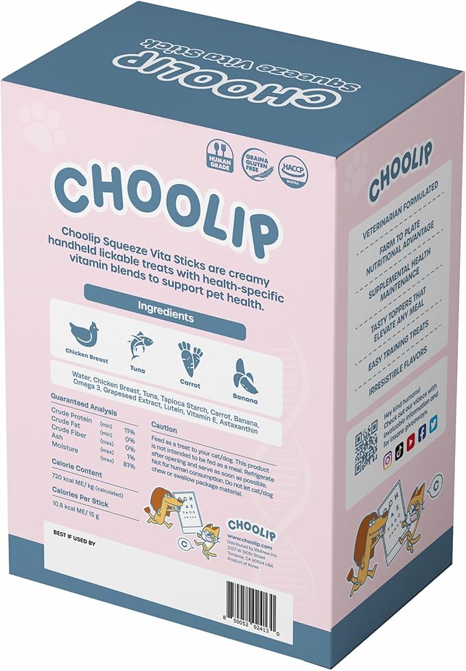 - CREAMY PASTE TREAT: They’ll do anything for a Vita Stick! Cat dessert, dog lick mats, dog food and cat food toppers, handfed lickable cat treats, puppy training, medicine, distraction, or a reward! Formulated for kittens and puppies 3 months and older, and ideal for elderly dogs and senior cat food. So irresistible they’ll try and eat the wrapper too! Choolip Squeeze Vita Sticks, For The Love of Pets