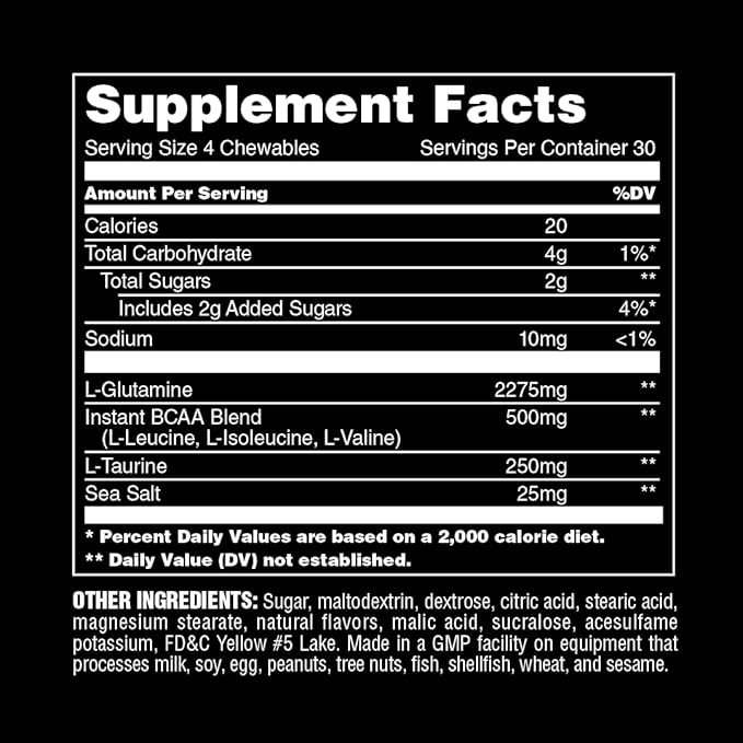 - The Power of BCAAs in a Chew: Improved recovery, reduced soreness, improved hydration, and promote muscle rebuilding with this next level supplement, just four chews per serving provides 2275mg of L-Glutamine, and 500mg of BCAA
