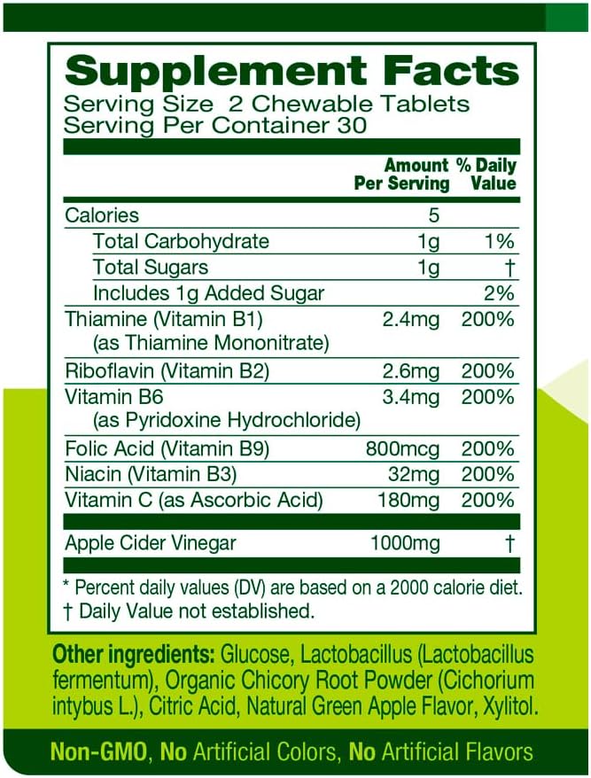 - APPLE CIDER VINEGAR SUPPLEMENT – This dietary supplement is formulated with Apple Cider Vinegar, which is known to be good for heart health along with Vitamins that promote energy production in the body and Probiotics that support digestion. Made to support your digestive health, this daily health supplement comes in easy to chew tablets. This uses only top quality ingredients and contains NO fillers, non-GMO, and no artificial colors or flavors added.