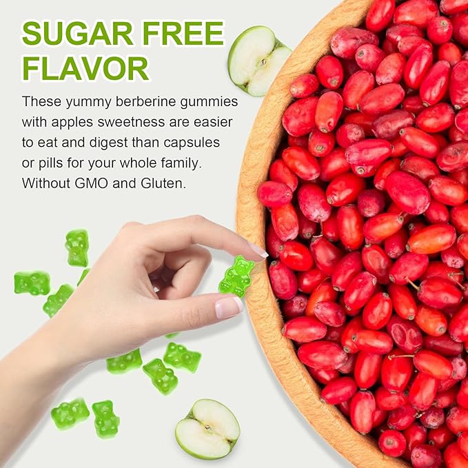 - Sugar-Free & Easy to Absorption: These berberine supplement gummies use the sugar-free fruit pectin. You can enjoy them without worrying about absorption burdens. The berberine supplement gummies are gluten-free, non-GMO and vegan and are fit for your whole family.