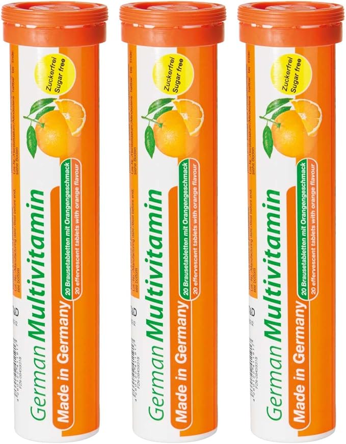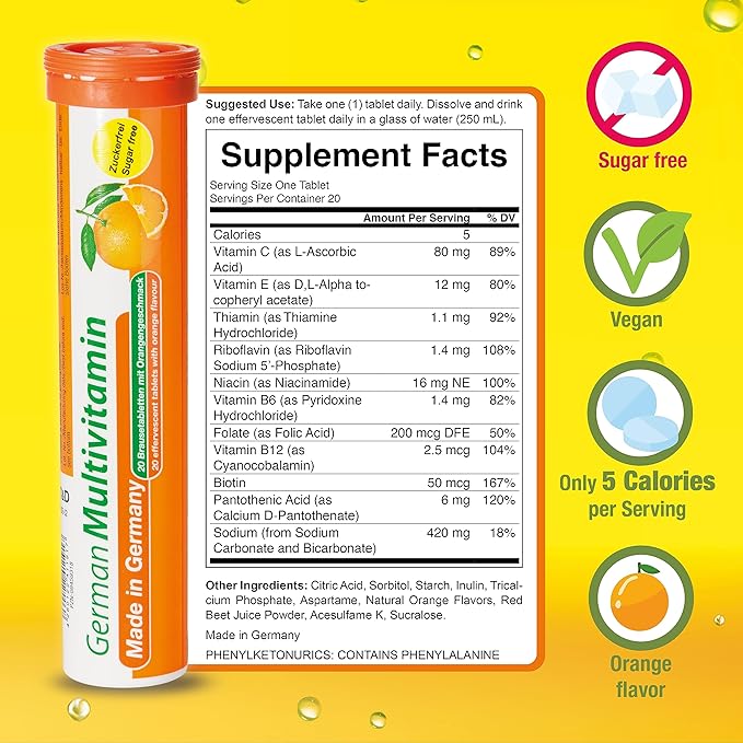 T&D German Multivitamin Drink Effervescnet Tablets 60 Servings Orange Flavour - Vitamin C, E, B1, B2, B6, B12, Biotin, Folic Acid, Niacin, Pantothenic Acid Pharma – Made in Germany
