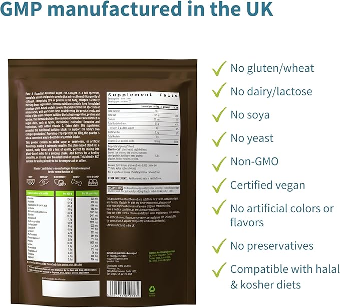 - COLLAGEN BUILDING BLOCKS: Vegan Collagen is a complete nutritional package, supplying the building blocks for collagen formation – the correct collagen amino acids at ideal ratios, sufficient protein & co-factor vitamin C
