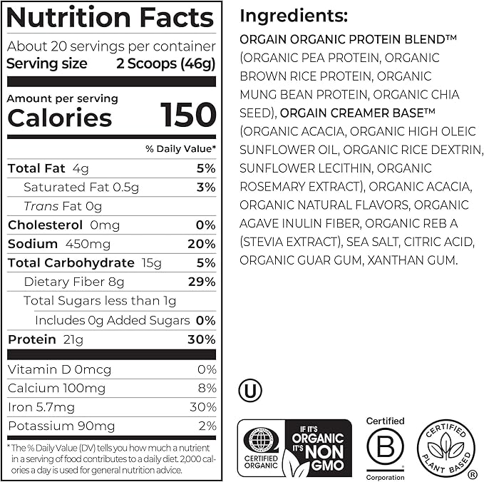 - CLEANER INGREDIENTS: 21g of Organic plant based protein and <1g sugar*. Our protein blend contains Organic peas, brown rice, mung bean, & chia seeds with all 9 essential amino acids. Each serving has low net carbs and features 8g of prebiotic + fiber* for gut support.