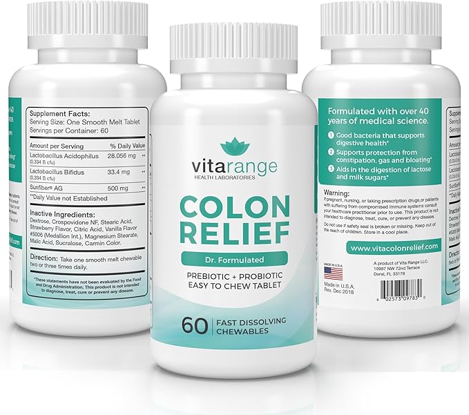 Colon Relief by VitaRange- Fast Constipation and Bloating Relief with Sunfiber Prebiotic Fiber and Pre + Probiotics for Digestive Health - 60 Chewable Strawberry Tablets – Doctor Formulated Probiotics