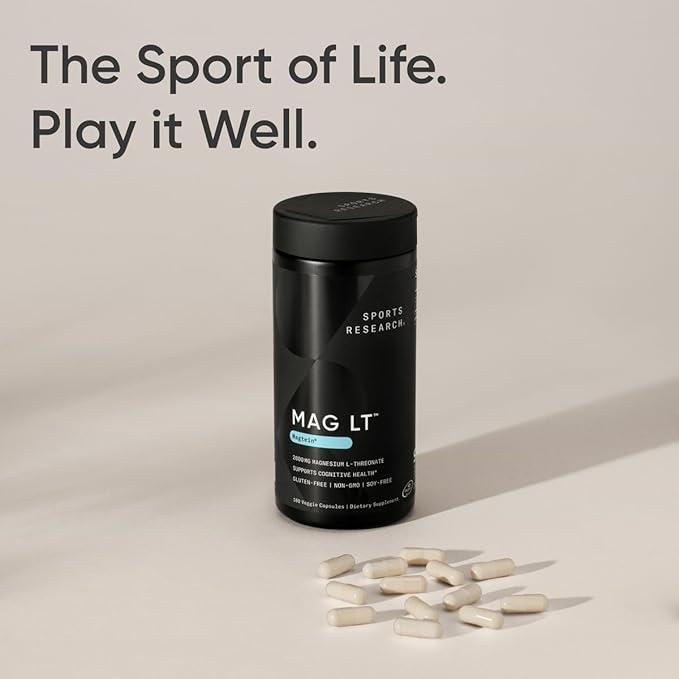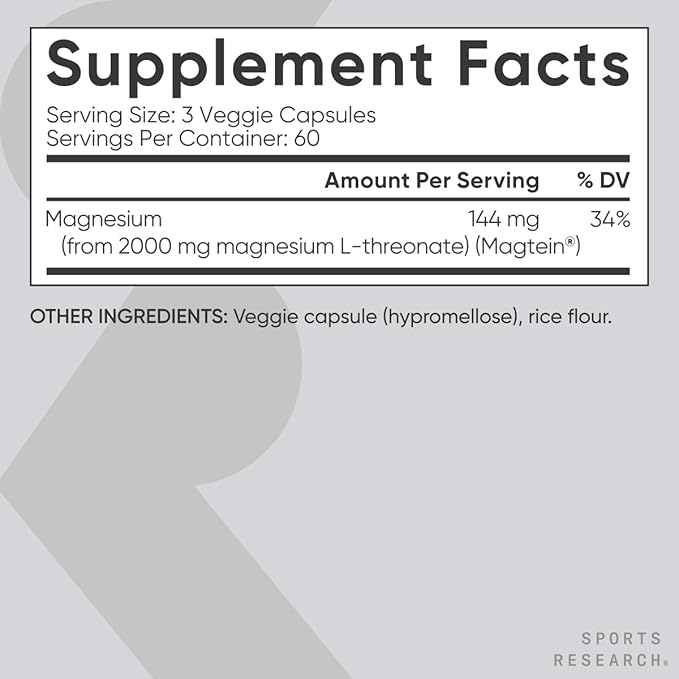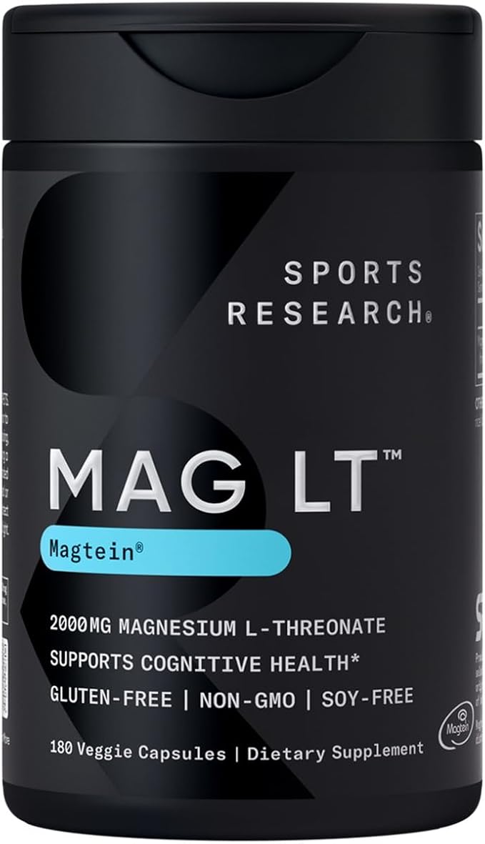 Sports Research Magtein Magnesium L-Threonate Capsules - Magnesium Supplement for Memory, Focus & Cognition - Magnesium L Threonate Supports Brain Health, Sleep & Mood- 2000mg, 180 Capsules for Adults