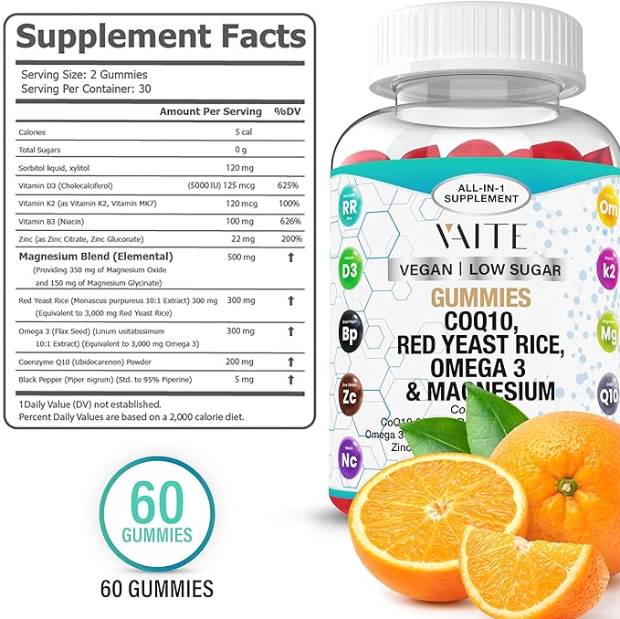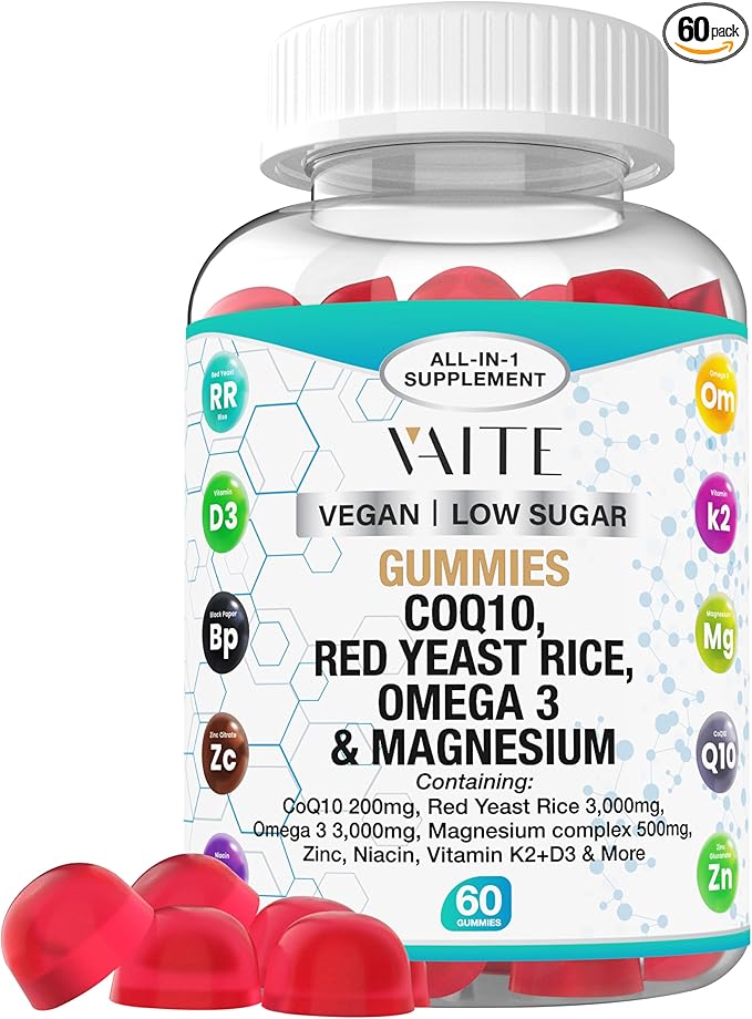 - COQ10 & RED YEAST RICE GUMMIES - Combining 8 powerful ingredients in one formula: Niacin, Zinc, Vitamin K2 D3, Omega-3, Magnesium, and more, offering optimal health benefits with just 2 easy-to-take gummies