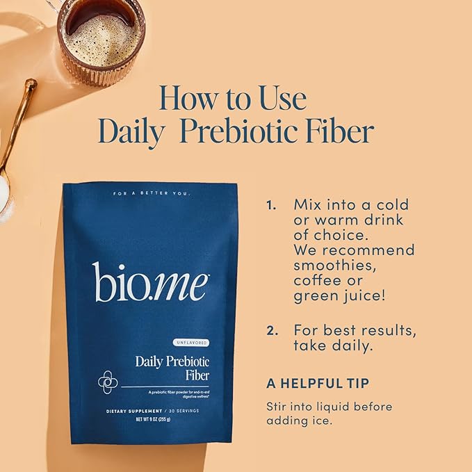 - VERSATILE AND CONVENIENT: Incorporating fiber into your diet has never been easier. Bio.me's prebiotic fiber powder unflavored is incredibly versatile, seamlessly mixing into warm and cold beverages, smoothies, and various foods. This tasteless dietary fiber supplement is perfect for daily use, making sure you get the digestive health support you need effortlessly.