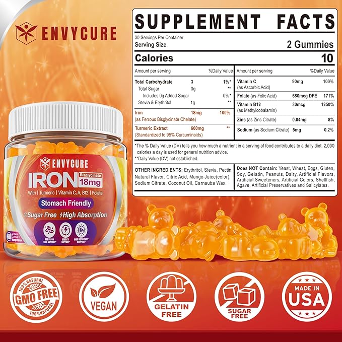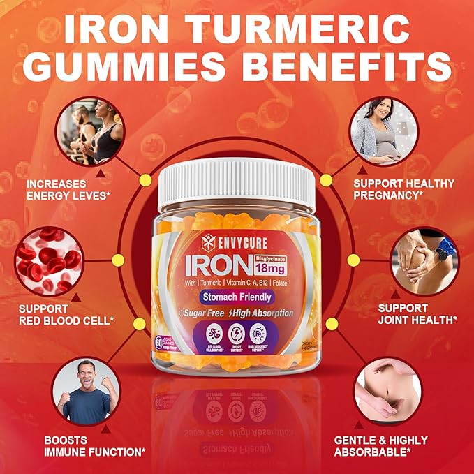 - đăPremium Iron Formula for Better Absorptionă Vegan Iron supplements gummies contain highÂquality iron and 100mg Vitamin C that works with the body to increase iron absorption rates. We also formula Turmeric, Vitamin B12, Folate, Zinc, and Sodium to our iron chewable gummy, which supports iron in promoting the growth of red blood cells, and also help your body increases energy, decreases fatigue & immune system health. Besides, 600mg Turmeric also can suppress stomach cramps, nausea & diarrhea.