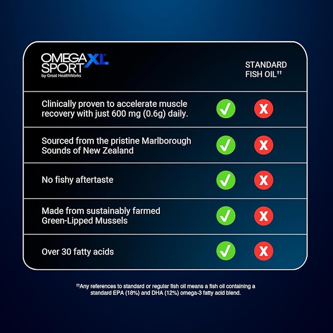 - EXTRA STRENGTH - OmegaXL Sport is a larger, more powerful version of the OmegaXL brand which was created in 2003. Our one-of-a-kind proprietary blend helps improve muscle recovery from overuse, or exercise, including DOMS (delayed onset of muscle soreness) in easy-to-swallow soft gels. OmegaXL Sport is made from the oil extract of green-lipped mussels sustainably farmed in the clean, pristine waters of the Marlborough Sounds of New Zealand.