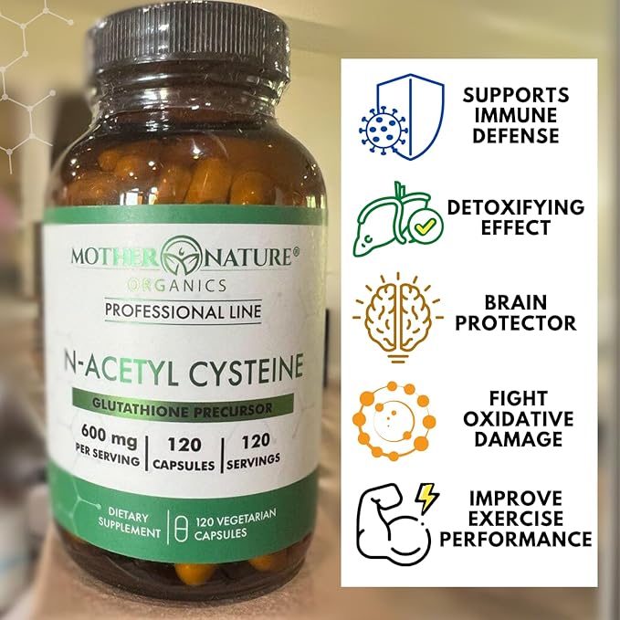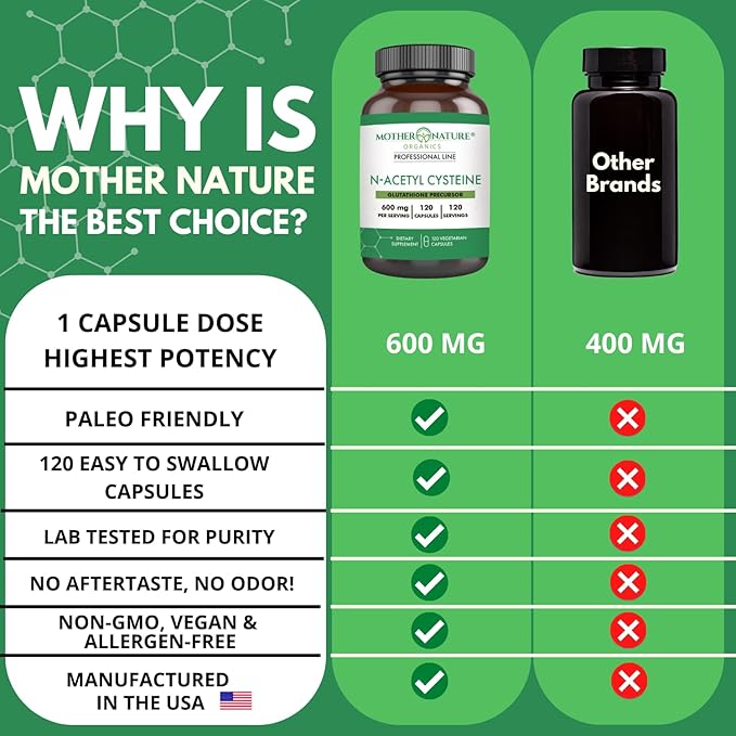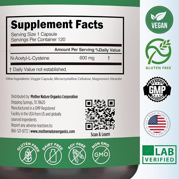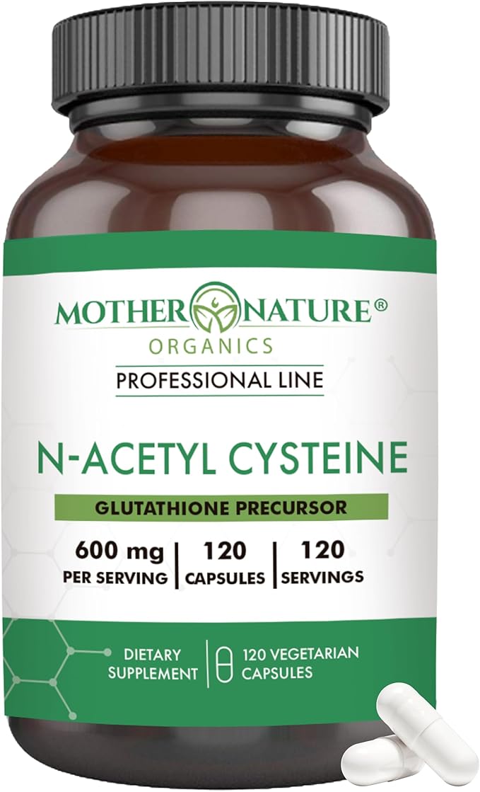 Mother Nature N-Acetyl-L-Cysteine, NAC 600 mg for Glutathione Production – Potent Antioxidant for Liver & Immune Support, Respiratory and Heart Health, 120 Capsules