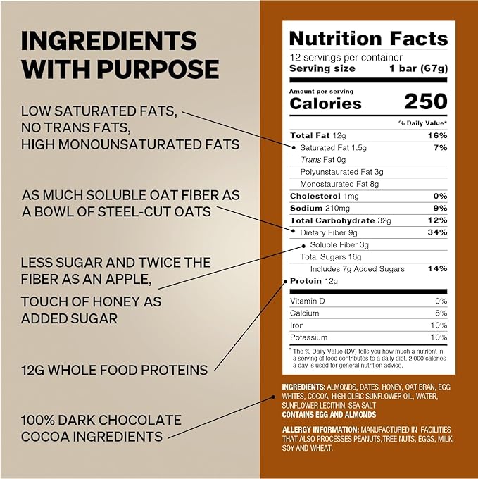- INGREDIENTS - almonds, dates, honey, oat bran, egg whites, cocoa, water, high oleic sunflower oil, sunflower lecithin, sea salt.