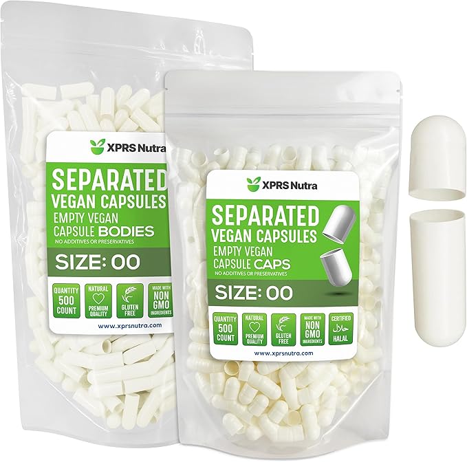 XPRS Nutra Vegan Size 00 Separated Capsules - 100 Count Premium Empty Capsules Separated in Bags - Separated Empty 00 Capsules - Pill Capsules Empty for DIY Supplement Filling (White)