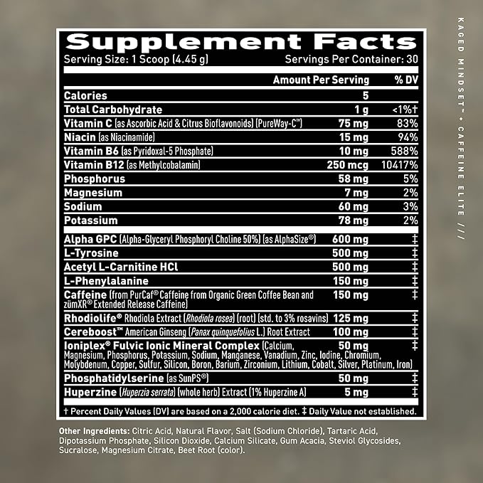 - THE ULTIMATE NOOTROPIC: Kaged Mindset Elite contains a powerful blend science-backed, premium ingredients including 1,200mg of Alpha-GPC for cognitive function, 1,000mg of L-Tyrosine for focus, 1,000mg of Acetyl L-Carnitine for mental clarity, and 300mg of L-Phenylalanine to support mood enhancement.