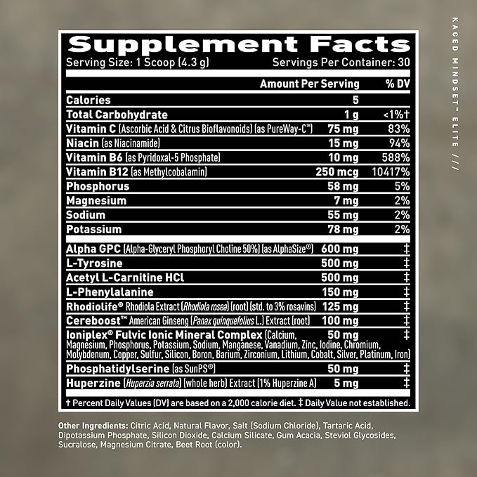 - THE ULTIMATE NOOTROPIC: Kaged Mindset Elite contains a powerful blend science-backed, premium ingredients including 1,200mg of Alpha-GPC for cognitive function, 1,000mg of L-Tyrosine for focus, 1,000mg of Acetyl L-Carnitine for mental clarity, and 300mg of L-Phenylalanine to support mood enhancement.