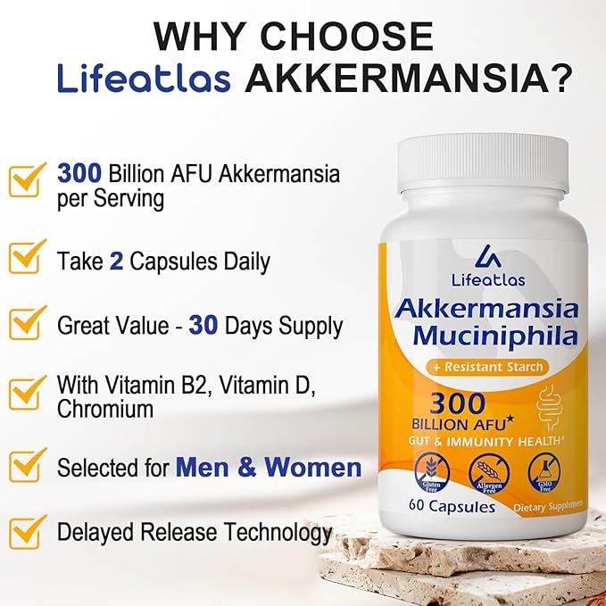 - Get Healthier with Lifeatlas Akkermansia: Akkermansia is a beneficial bacteria naturally found in the gut, not everyone has it, and it can only thrive in an oxygen-free environment, and it is low or completely lacking in people experiencing metabolic disease. You can take Lifeatlas 300 Billion AFUs Akkermansia daily to get this essential gut bacteria to keep gut health and get more GLP-1