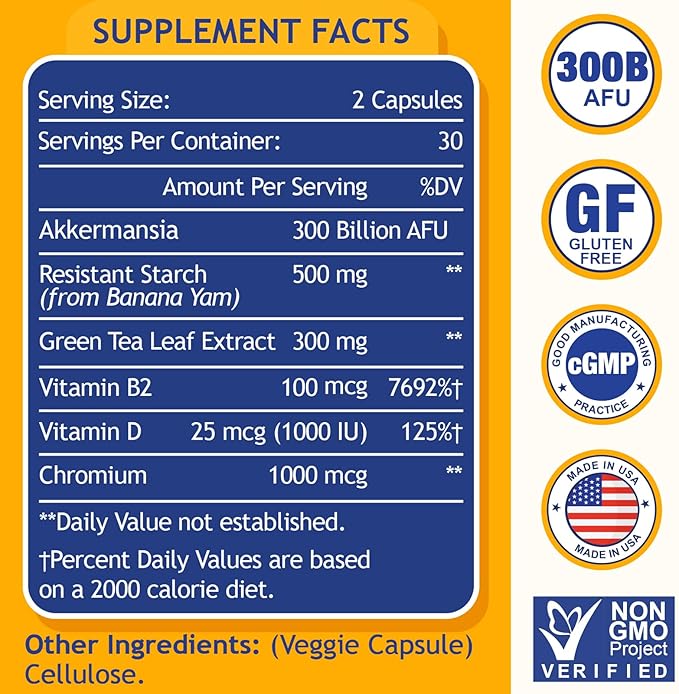 - 6-in-1 for Max Results: Akkermansia aims to strengthens intestinal walls and overall gut health, and GLP-1 production. Resistant Starch, is good for intestinal and gut health. Green Tea Leaf Extract, good for anti-aging & skin health. Vitamin B2 participates in various processes, helping to convert food into energy. Vitamin D plays an important role in the function of the immune systems. Chromium is beneficial for immunity. 6-in-1 to your daily health
