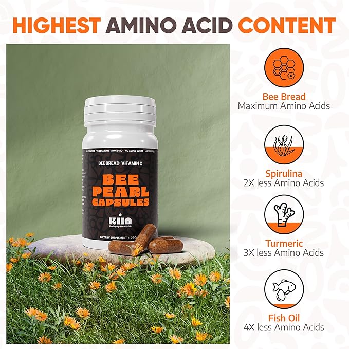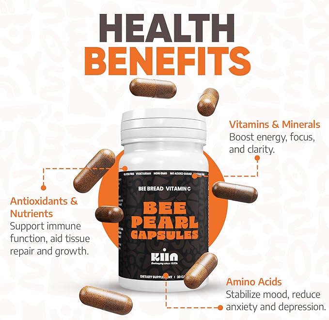 - šæMADE WITH PREMIUM ALL NATURAL INGREDIENTS: Rigorously tested for quality and purity. GMP and ISO-Certified, FDA registered, Non-GMO, Gluten and Corn-Free, no fillers, binders or additives, preservatives, no artificial sweeteners, no chemicals. With 15 years of dedication to bee bread, KIIN is led by a third-generation family of North European bee keepers with roots dating back to 1920, focusing on producing natural, multi-floral bee products. KIIN's commitment to sustainable beekeeping practices ensures a love for nature, minimal waste, and bee protection. Beekeeper 's approved!