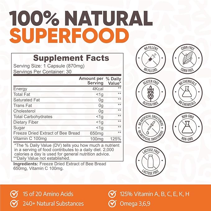- šæ SUPERIOR NUTRIENTS: Our unique bee bread capsules from Northern Europe are enriched with Antioxidants, Vitamin A, Vitamin B, Vitamin C, Vitamin A, K, H and E, Amino Acids, Proteins, Minerals, Zinc, Iron, Histamine, Dietary Fiber, Omega 3,6 and 9. Over 250 vital organic nutrients for health. Bee vitality offers comprehensive essential nutrition and health benefits. Made form 100% natural raw bee bread (fermented bee pollen). Contains 30 caps.