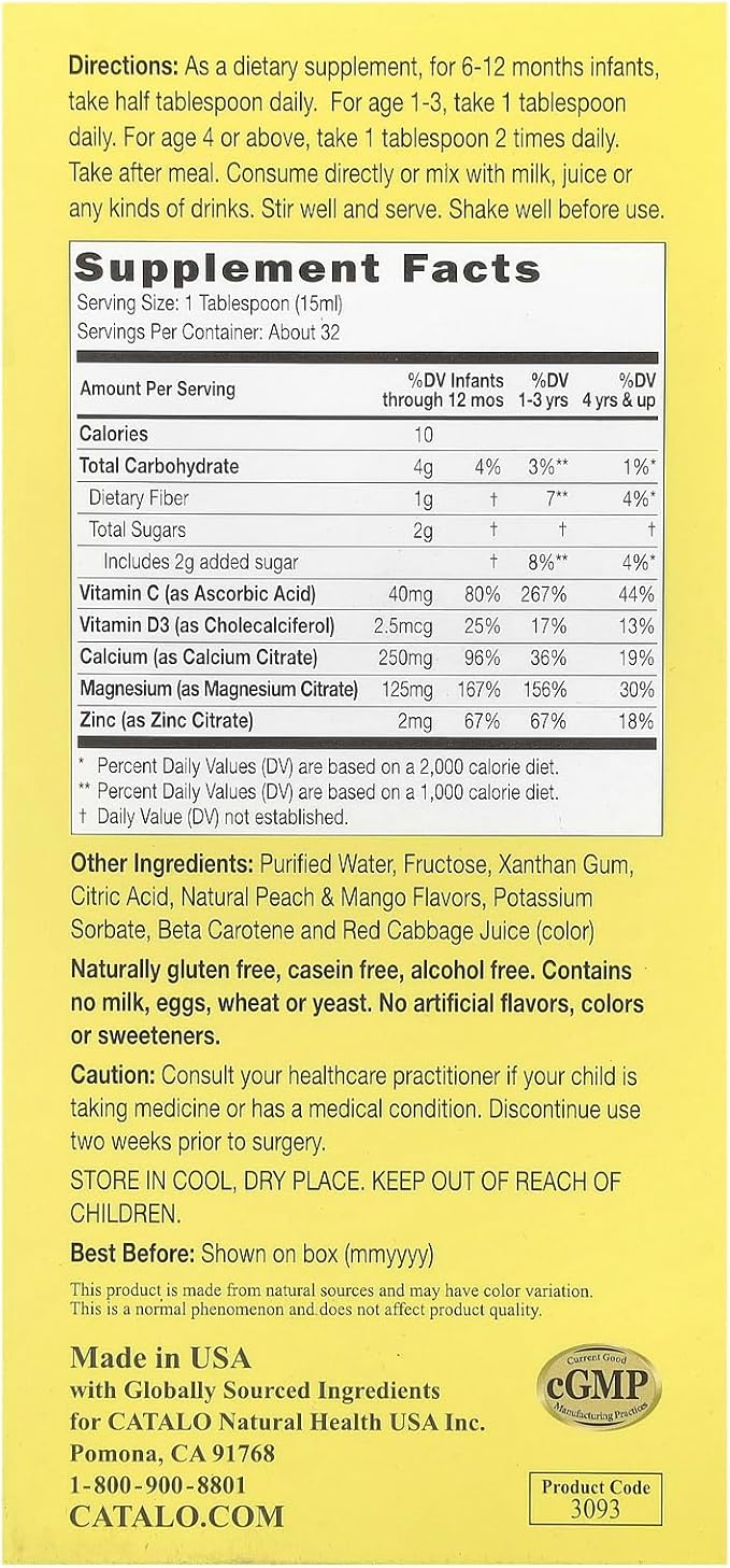 CATALO Children’s Liquid Calcium with Magnesium & Zinc, Peach and Mango Flavor, Multi-Minerals Profile Supports Bone & Teeth Growth, Boosts Immunity, High Absorbable, No Artificial Colors or Flavors