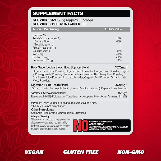 - Energy & Overall Wellness - Boost your daily energy levels and enhance your overall wellness with our Reds Powder Supplement. Packed with natural ingredients, this superfood beets blend provides energy support throughout the day. Feel more vital and focused as you tackle your daily tasks.