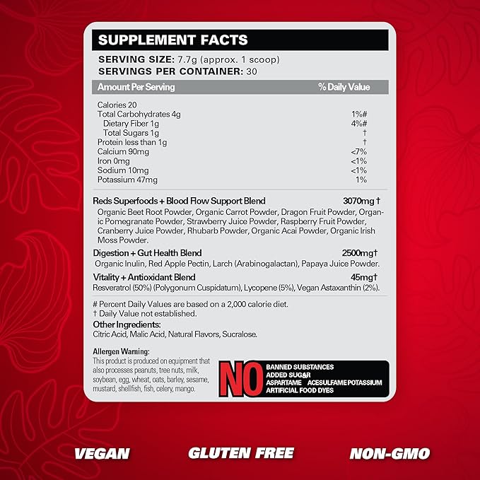 - Energy & Overall Wellness - Boost your daily energy levels and enhance your overall wellness with our Reds Powder Supplement. Packed with natural ingredients, this superfood beets blend provides energy support throughout the day. Feel more vital and focused as you tackle your daily tasks.