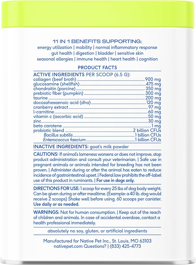 - Power-Packed Ingredients: With 12 active ingredients, our multivitamin powder for dogs packs 5x more actives than leading chews. Get vitamins for dogs, collagen for dogs, glucosamine for dogs, omega 3 for dogs, probiotics for dogs, and taurine for dogs—all in one scoop