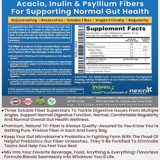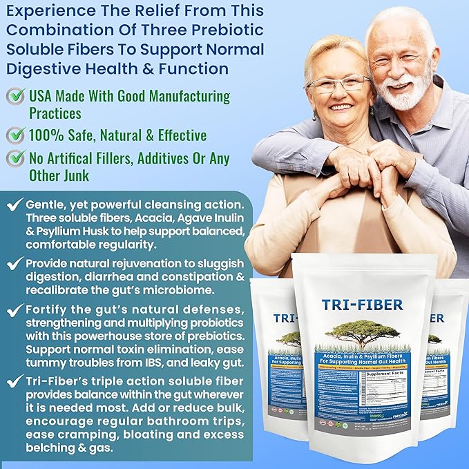 - This product combines three scientifically-based fiber powders: Acacia Fiber, Agave Inulin Fiber, and Psyllium Husk Fiber, all of which contribute to sustaining healthy gut function. Whether you're dealing with gas, bloating, frequent trips to the bathroom, or digestive discomfort associated with conditions like IBS, IBD, or leaky gut, Tri-Fiber has the potential to revolutionize your digestive well-being.
