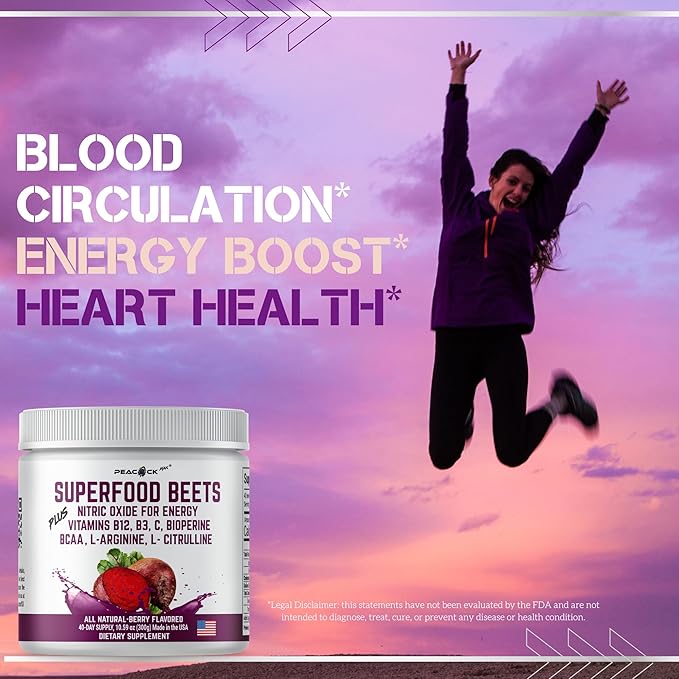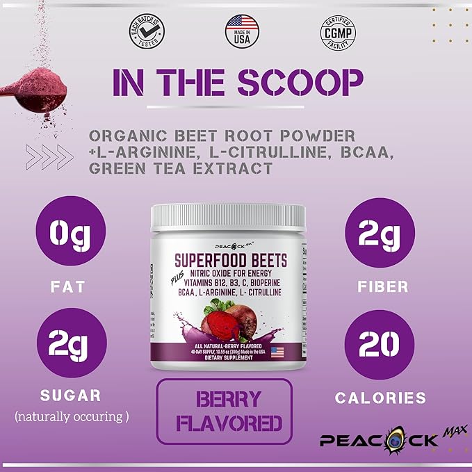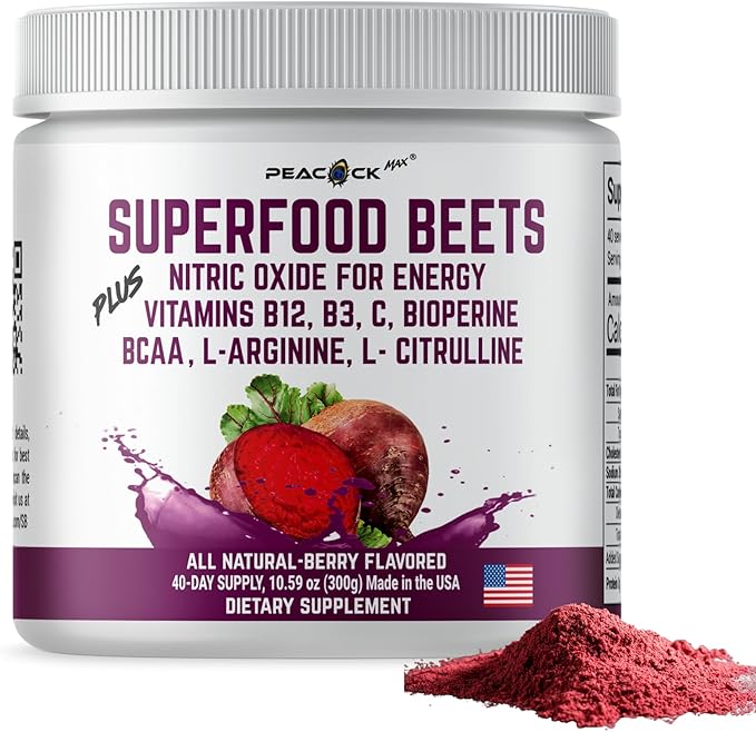 - Natural Nitric Oxide Boost for Vitality: Revitalize your energy with Peacock Max Beet Root Powder, powered by natural nitric oxide production to support healthy blood flow, circulation, and vitality. Infused with green tea extract and antioxidants, it’s a perfect partner for an active lifestyle.