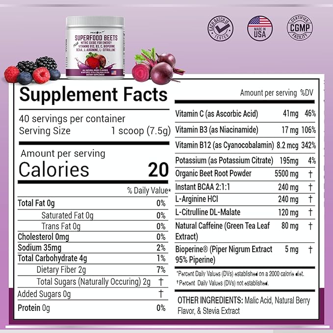 Beetroot Powder, 10.59 oz, 40 Servings - Superfood for Blood Pressure Support, Nitric Oxide Booster, Beet Root Extract, BCAA for Heart Health, Green Tea Extract, Berry Flavor