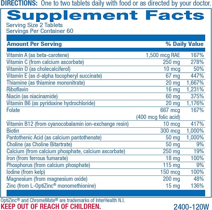 - The multivitamin contains vitamins A, B complex, C, D, and E. It also contains minerals like choline, calcium, phosphorus, iodine, magnesium, zinc, selenium, copper, manganese, chromium, and more.