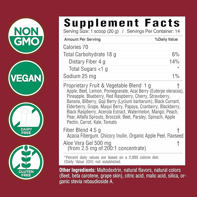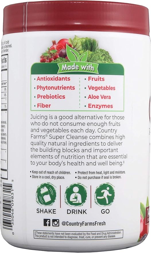 - 34 FRUITS & VEGETABLES. Country Farms Super Cleanse is a delicious, pomegranate-acai flavored powder drink mixed bursting with 34 superfoods, including blueberry, raspberry, goji, acai, kale, tomato and more!