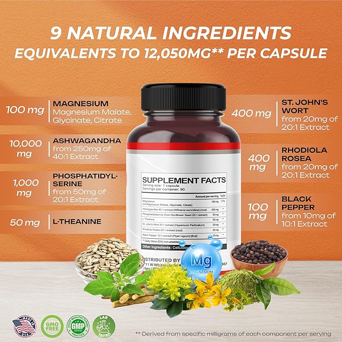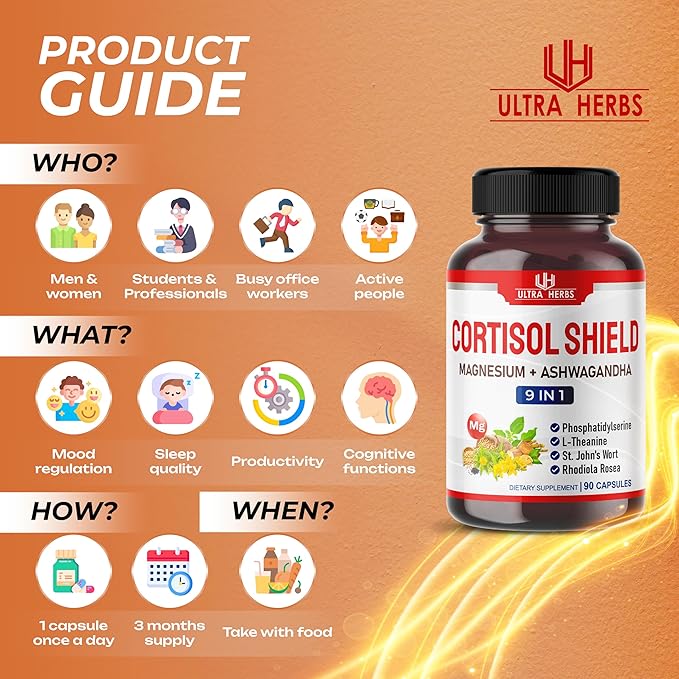 - THE IDEAL MIX: Within each capsule of Ultra Herbs Cortisol Support, you'll find a potent fusion of 9 natural elements, forming a robust blend. This dynamic composition includes Magnesium Malate, Glycinate, Citrate, Ashwagandha, Phosphatidylserine, L-Theanine, St. John's Wort, Rhodiola Rosea, and Black Pepper. A single daily capsule is all you need to unlock the full advantages of this unique combination.