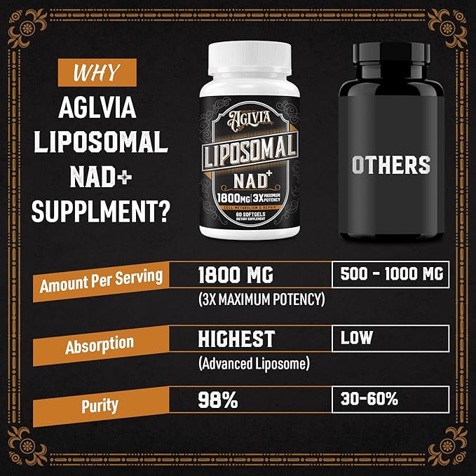 - ✔ Trusted Quality: Proudly made in the USA under stringent quality standards, AGLVIA Liposomal NAD 1800 mg supplement epitomizes excellence. From premium ingredients to rigorous quality controls, each softgel reflects our unwavering commitment to your well-being. Opt for a product that aligns with your health journey and trust in our dedication to providing the finest wellness support.
