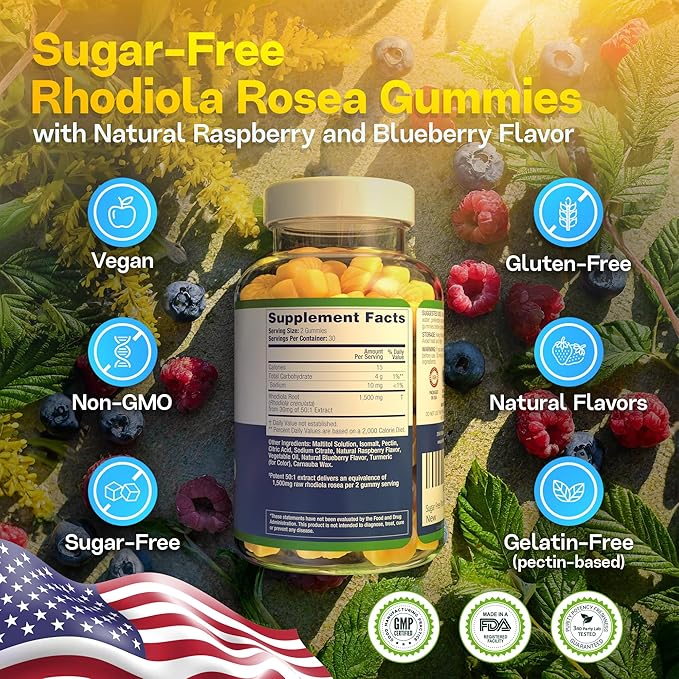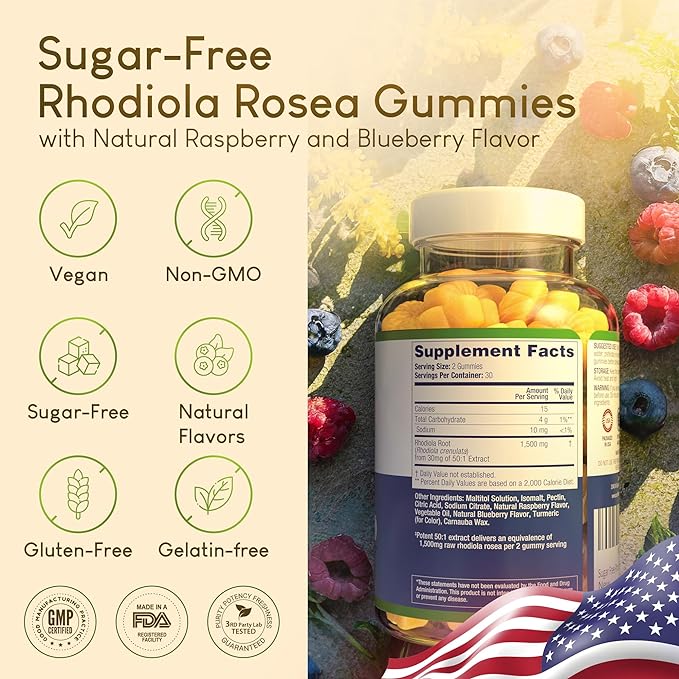 - [Made in the USA] - Our vegan and non-GMO rodiola rosea gummies are made in an FDA and GMP-registered facility within the US to be held to the highest standards. We only use natural flavors, colors, and potent ingredients to yield the desired results in our hassle-free rodhiola gummies.