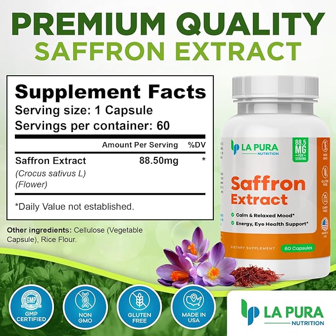 - Pure Saffron Power: Containing 88.5 mg pure saffron extract per serving, LaPura’s Saffron Extract is a premium quality saffron supplement that harnesses the power of pure saffron extract to support your overall well-being. Saffron extract is known for offering mood, energy, heart & eye health support and also helps boost metabolic function to help you achieve your weight management goals.