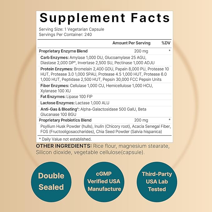 - Each serving delivers 400mg total, combining 20 enzymes with 5 prebiotics including 200mg of psyllium husk, inulin, acacia senegal, FOS, and chia seed, as well as 200mg of carbs, proteins, fibers, fats, and lactose enzymes.