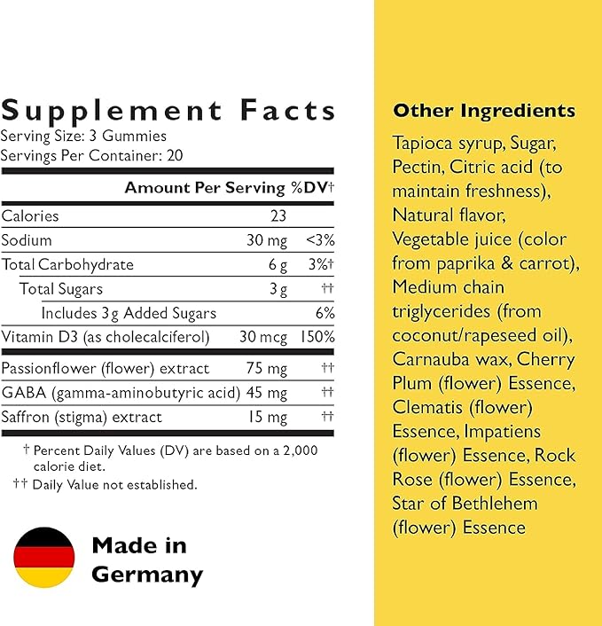 - KEY NUTRIENTS & BOTANICALS: Saffron, Passionflower, GABA, and Vitamin D