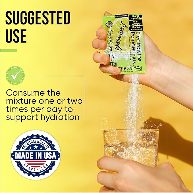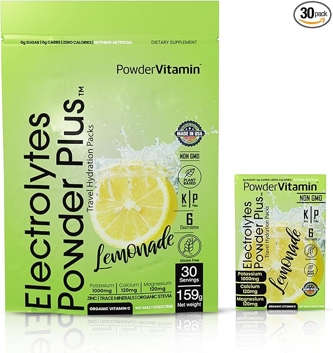 - Electrolyte Powder - Electrolytes Powder Plus contains 1000 mg of potassium opposed to only 250 mg in other brands. Additional we offer a unique flavor and blend of Magnesium, Calcium, Organic Pink Himalayan salt. Our delicious and hydrating blend of Lemonade flavor includes 30 hydration packets for exercise, travel, or long nights. PowderVtmain Electrolytes Powder plus travel hydration packets has you covered.
