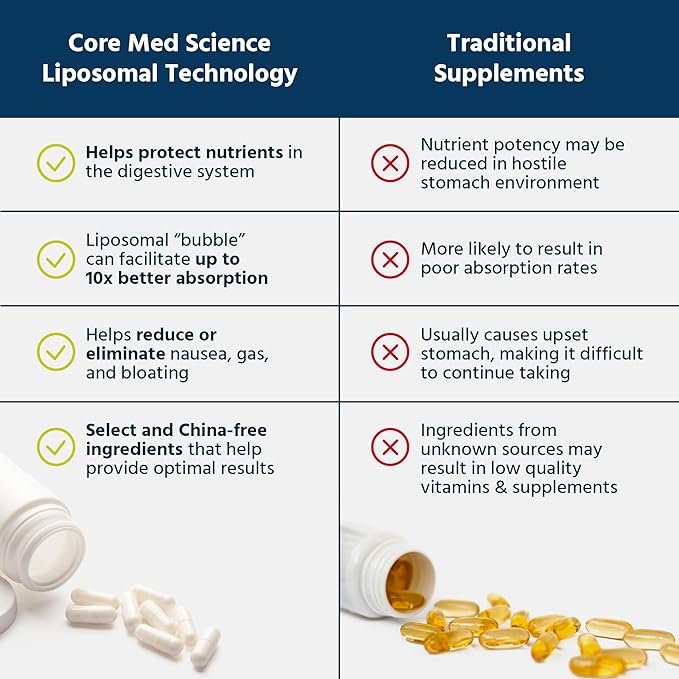 - MAXIMUM ABSORPTION LIPOSOMAL TECHNOLOGY: Unlike traditional pills and liquids, where the active ingredients get destroyed by acids in the digestive tract, Core Med Science uses Liposomal Technology to protect nutrients with a liposomal "bubble" to safely deliver nutrients into the bloodstream for optimal absorption. Provides up to 80% more absorption and is also gentler on your stomach.