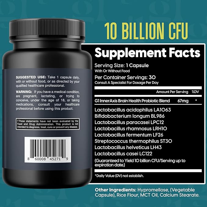 InnerAxis 2-in-1 Brain and Gut Health Probiotic, 10 Billion CFU, 8 Probiotic Strains for Gut, Psychobiotic, Mood and Brain Support, Acidophilus Probiotic for Women and Men, 30 Servings