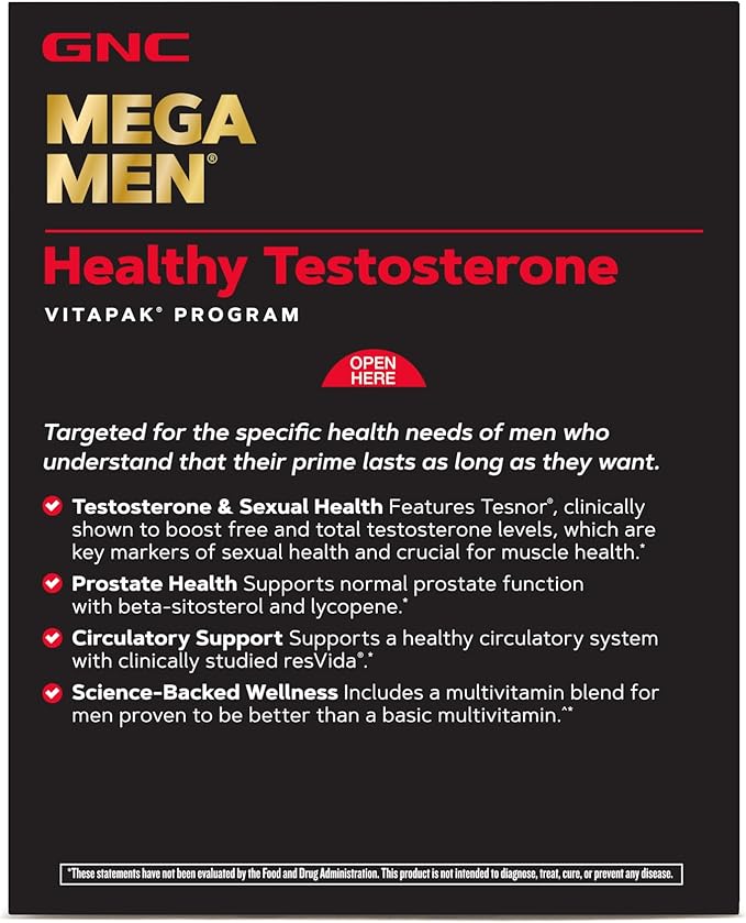 - GNC’S BEST NUTRITION AND TESTOSTERONE SUPPORT: Get a clinically proven testosterone booster, a men’s multivitamin with immune support, and help for prostate and circulatory health in every GNC Mega Men Healthy Testosterone Vitapak Program. Save up to 40% compared to buying everything separately.
