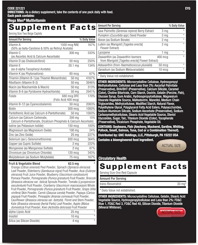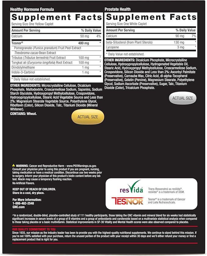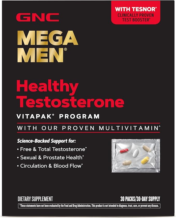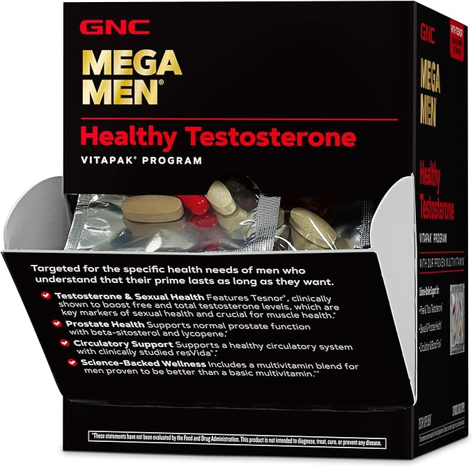 - GNC’S BEST NUTRITION AND TESTOSTERONE SUPPORT: Get a clinically proven testosterone booster, a men’s multivitamin with immune support, and help for prostate and circulatory health in every GNC Mega Men Healthy Testosterone Vitapak Program. Save up to 40% compared to buying everything separately.