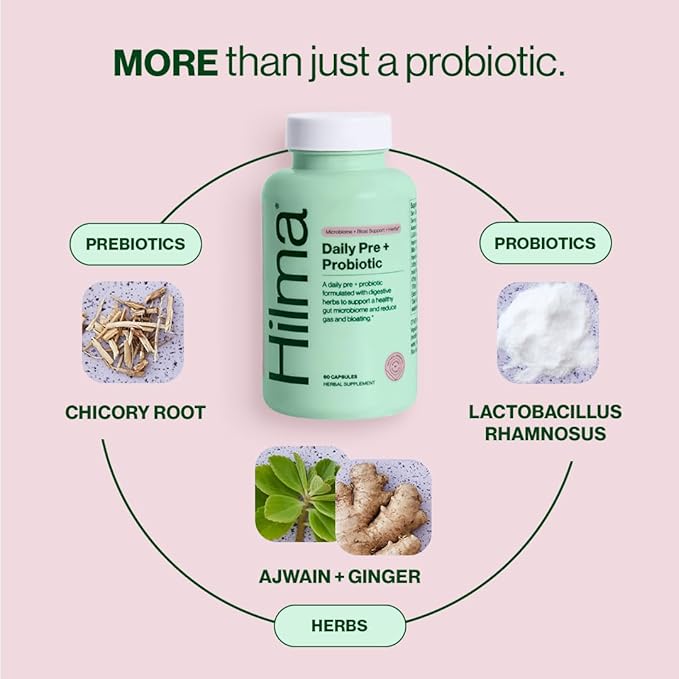 Hilma Daily Pre + Probiotic + Herbs – Support Gut Health with Prebiotics and Probiotics Plus Gas and Bloating Relief for Women & Men – 60 Vegan Capsules