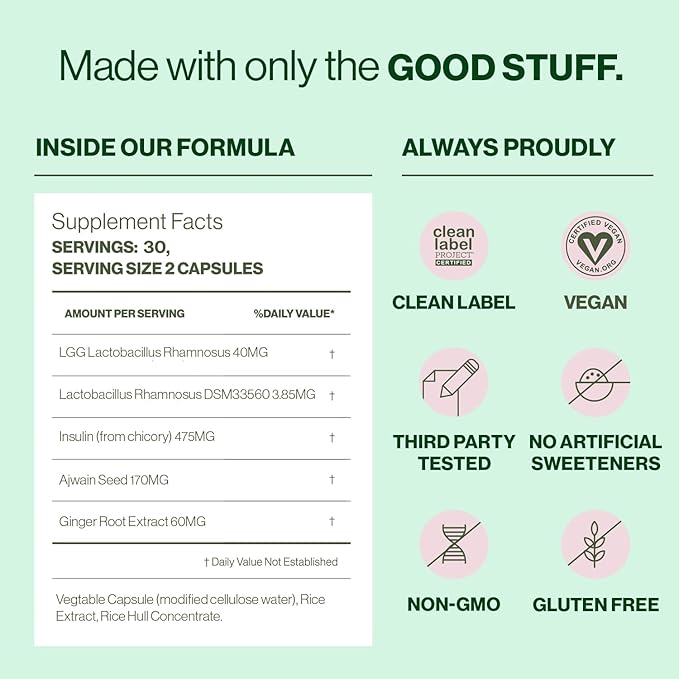 - For best results: Take 2 easy-to-swallow capsules daily to support a healthy microbiome, digestive health and help relieve gas and bloating