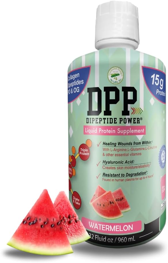 Nutritional Designs DPP Dipeptide, Wound-Healing Liquid Collagen & Whey Protein Supplement, Sugar-Free, Promotes Healthy Skin & Hair for Men & Women (Watermelon, Bottle 32 Fl Oz)