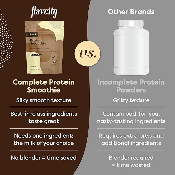 - DITCH THE BLENDER: FlavCity’s Butter Coffee Protein Smoothie is a delicious and nutrient-dense blend of cold brew coffee powder and organic butter powder. We’ve simplified the smoothie-making process by incorporating all the high-quality ingredients you love in each scoop — no add-ins needed! With 25g of protein per serving, our complete protein smoothies are sure to be your new go-to post-workout beverage or snack. 20 servings; 87g of caffeine per serving.