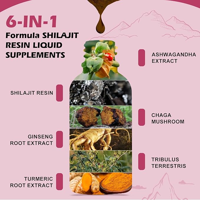 Shilajit Resin Liquid Drops | Organic Shilajit 85+ Trace Minerals Complex with Ashwagandha, Turmeric, Ginseng, Chaga, Shilajit Supplement for Men Immune Support, Brain Booster, Energy, Overall Health